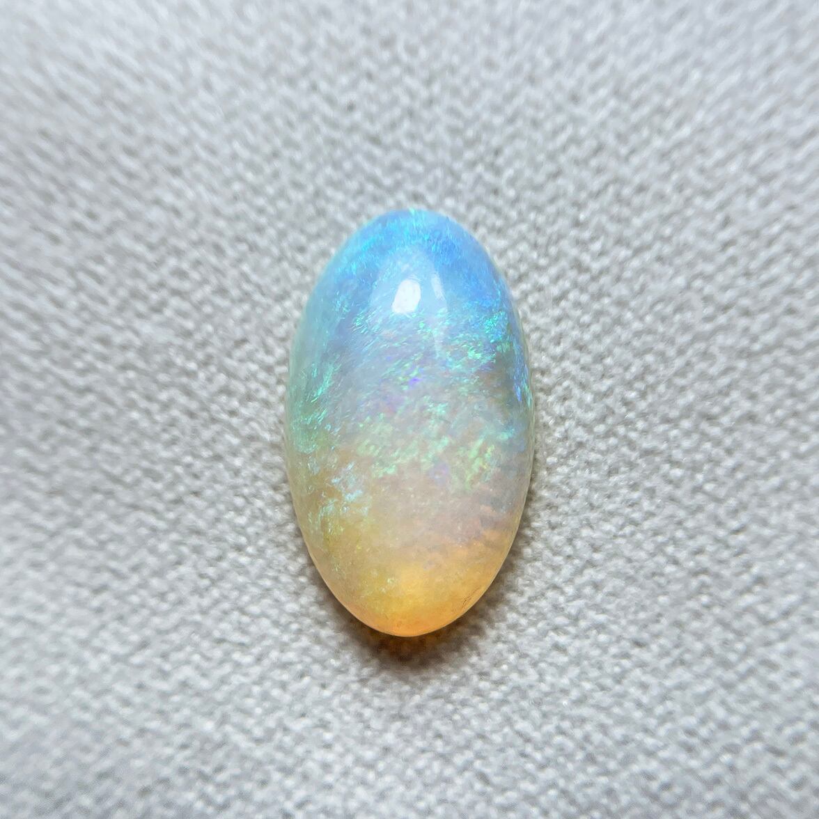 乳白色系(角度と光源によりクリアオレンジ)の地色に青や緑の遊色が浮かぶ美しいルースです。