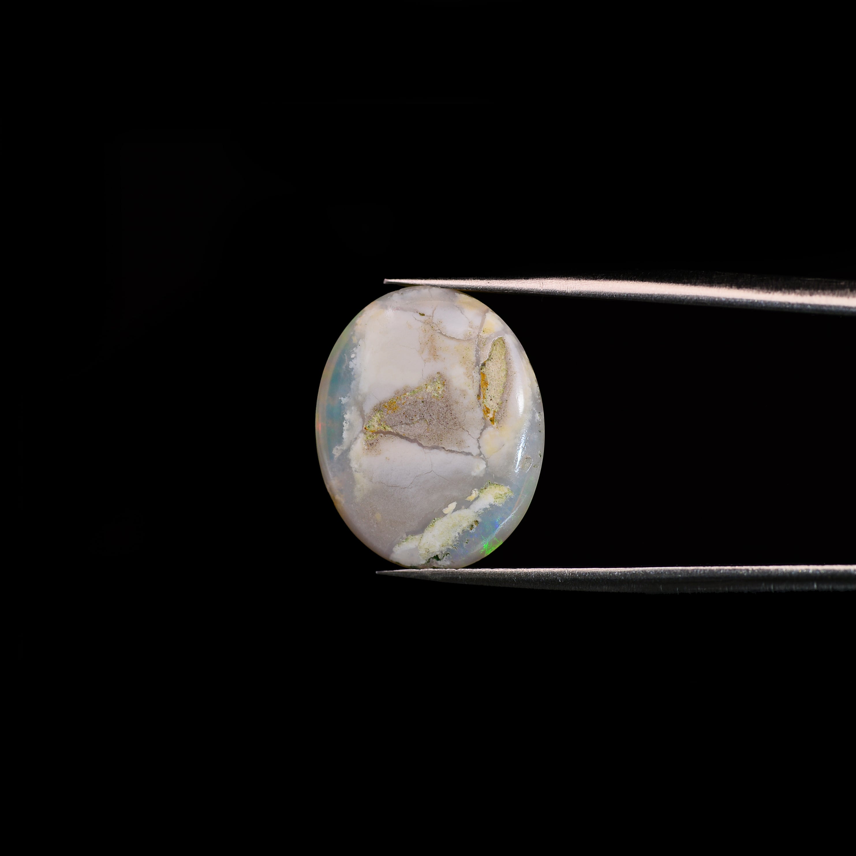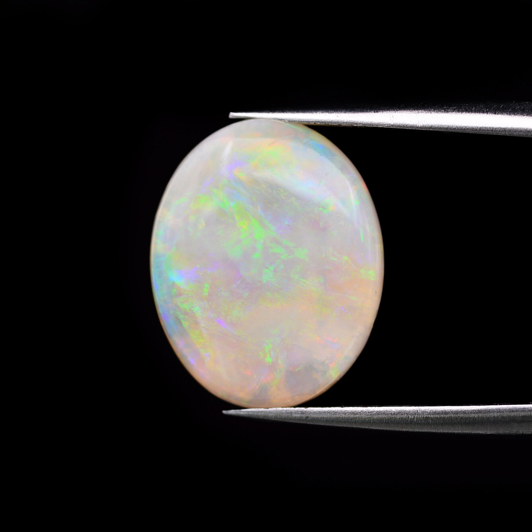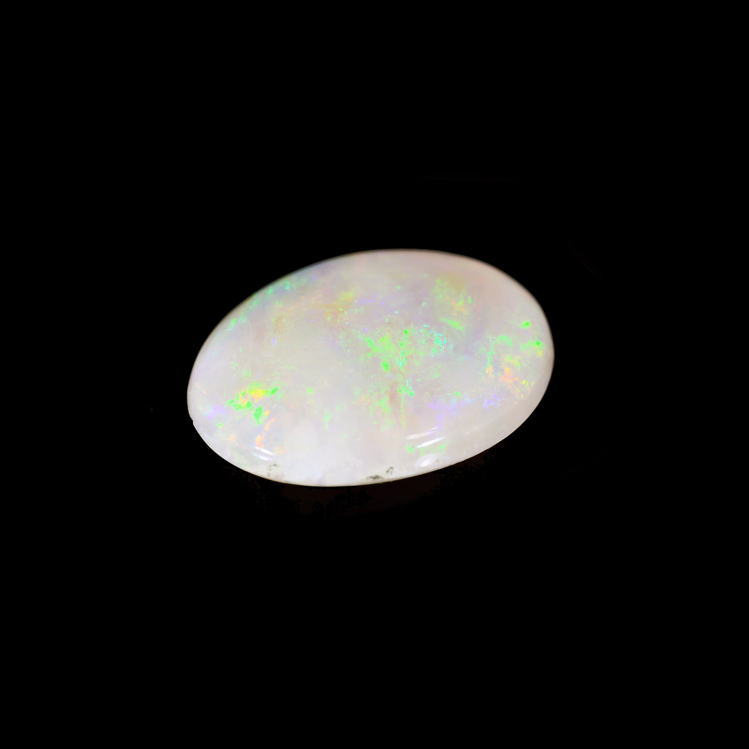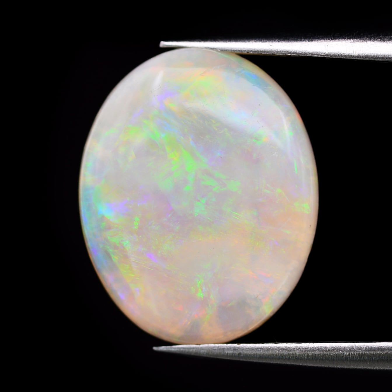 乳白色系の地色に青や緑、オレンジ色の繊細な遊色が浮かぶ美しいルースです。